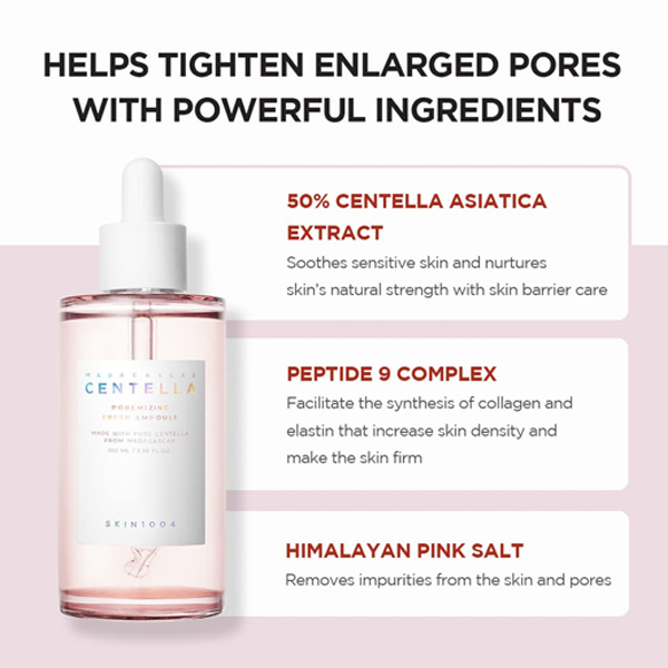 This SKIN1004 Madagascar Centella Poremizing Fresh Ampoule targets the appearance of enlarged pores. Formulated with Pink Himalayan Salt which is packed with clarifying minerals it helps to cleanse impurities that are built up deep within the pores. This pore minimising ampoule also contains Centella Asiatica which provides soothing, hydrating, calming and strengthening properties, helping to repair the skin barrier and accelerate wound healing. Skin1004’s Peptide 9 Complex promotes skin elasticity helping to reduce enlarged pores.