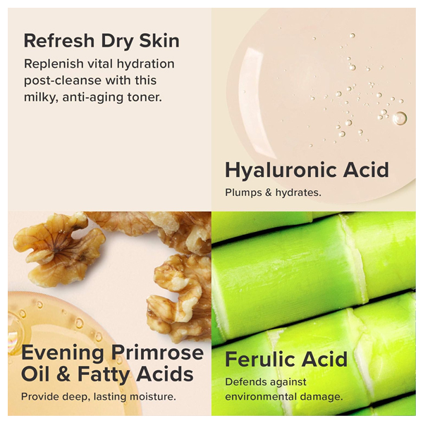 An anti-aging toner that replenishes skin with essential nutrients, fatty acids & hyaluronic acid to visibly plump & soothe after cleansing.
