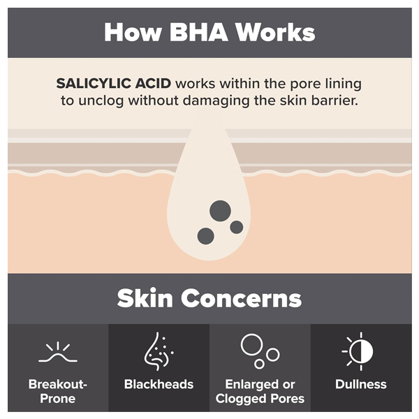 Skin becomes dull, dry and congested when dead skin cells build up on its surface. Beta hydroxy acid (BHA, also known as salicylic acid) mimics the natural exfoliation process of younger skin by helping it shed extra layers while unclogging and clearing pores.