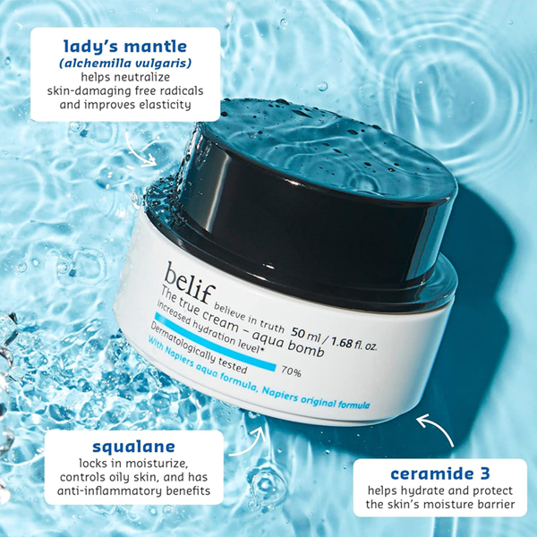 Belif The true cream – aqua bomb is an ultra-lightweight, gel-cream that instantly cools and refreshes the skin while providing intensive hydration or a healthy glow. This gel-based moisturizer ‘floods’ the skin with a rush of refreshing hydration and minimizes the appearance of pores for soft, smooth, supple skin. It is clinically proven to increase skin hydration levels by 70%.