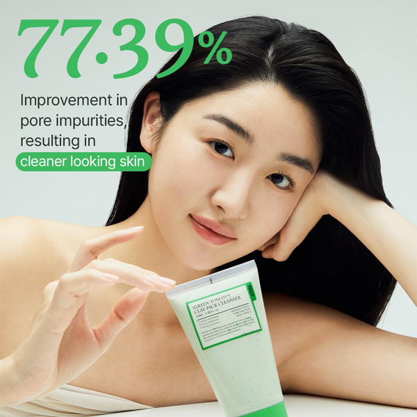 A vegan clay mask cleanser contains 49% Green Tomato Extract that aids in deep exfoliation and helps control excessive sebum production.