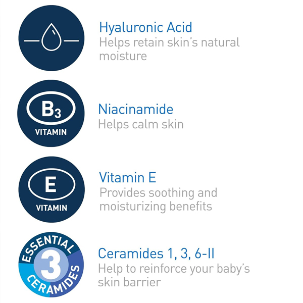 CeraVe Baby Moisturizing Lotion was developed with pediatric dermatologists to lock in hydration throughout the day. This non-greasy, lightweight baby lotion spreads easily on delicate skin to deliver three essential ceramides that help maintain the skin barrier as it develops. Enhanced with niacinamide, hyaluronic acid and vitamin E, our fragrance-free and paraben-free baby lotion delivers soothing and moisturizing benefits for baby’s delicate skin while providing long-lasting hydration throughout the day.