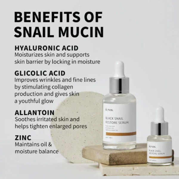 The iUNIK Black Snail Restore Serum is a repairing anti-aging serum. Formulated with 70% Black Snail extract to help repair skin and keep skin supple and smooth, and 5 black superfood extracts (black rice, black bean, black sesame, eggplant, sea tangle) to keep skin youthful with powerful antioxidant effects. Suitable for all skin types.