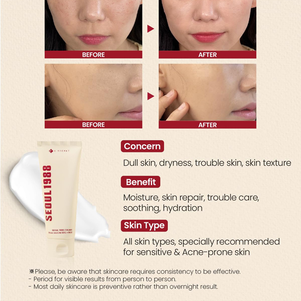 K-Secret Seoul 1988 Snail Mucin Cream 93% with Rice is designed to address concerns such as dull skin, dryness, troubled skin, and uneven texture. Suitable for all skin types, including sensitive and acne-prone skin, this cream offers deep hydration, moisture, skin repair, trouble care, and soothing benefits. With 93% snail mucin filtrate, it provides intense hydration, preventing dryness and promoting long-lasting moisture. The cream helps calm irritated and sensitive skin, reducing redness, while ingredients like Ectoin and Panthenol work to strengthen the skin barrier and enhance healing. It also promotes collagen production, improving skin texture, elasticity, and firmness, resulting in smoother, softer skin. The rice blend further boosts skin texture, brightens the complexion, and nourishes the skin, making it a perfect addition to any anti-aging skincare routine.