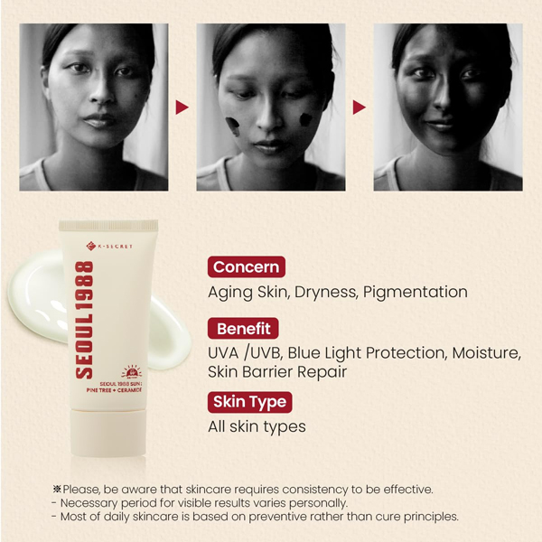 A sunscreen offering SPF 50+ PA++++, enriched with pine tree extract and ceramide, soothes irritated skin and strengthens the skin barrier.