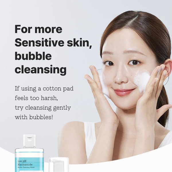 COSRX Low pH Niacinamide Micellar Cleansing Water is a low pH cleansing water that gently removes makeup and impurities while keeping skin hydrated.Helps control excessive sebum production with Niacinamide and Zinc PCA.Contains Sodium Hyaluronate and Panthenol to hydrate and strengthen skin barrier.Completed eye irritation test.Suitable for sensitive skin.