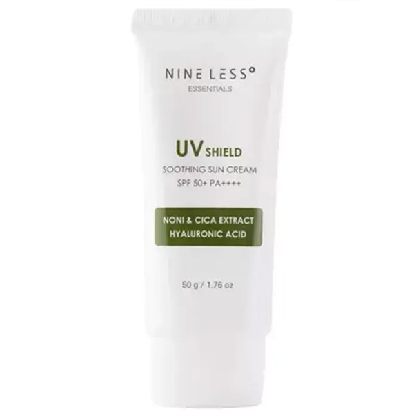 The Nine Less Essentials UV Shield Soothing Sun Cream SPF 50+ PA++++ is a clean and effective sunscreen that protects skin. It contains skin calming ingredients and leaves no white cast with a velvet matte finish.