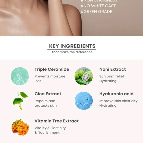 Water, Acrylates Copolymer, Butylene Glycol, Ethylhexyl Palmitate, Butyloctyl Salicylate, Glycerin, Ethylhexyl Triazone, Diethylamino Hydroxybenzoyl Hexyl Benzoate, 1-2 Hexanediol, Niacinamide, Dicaprylyl Carbonate, C14-22 Alcohols, Cetearyl Olivate, Bis-Ethylhexyloxyphenol Methoxyphenyl Triazine, Vinyl Dimethicone/Methicone Silsesquioxane Crosspolymer, Sorbitan Olivate, Poly C10-30 Alkyl Acrylate, C12-20 Alkyl Glucoside, Methyl Glucose Sesquistearate, Polyacrylate, Crosspolymer-6, Cetearyl Alcohol, Glyceryl Stearate SE, Prunus Amygdalus Amara Kernel Oil, Hedera Helix Leaf/Stem Extract, Adenosine, Pyrus Malus Fruit Extract, Disodium Edta, Stearic Acid, T-Butyl Alcohol, Vanilla Planifolia Fruit Extract, Jasminum Officinale Flower Water, Glucose, Macadamia Ternifolia Seed Oil, Caprylic/Capric Triglyceride, Propanediol, Hyaluronic Acid, Tocopherol, Brassica Campestris Sterols, Cholesterol, Phytosteryl/Behenyl/Octyldodecyl Lauroyl Glutamate, Phenoxyethanol, Centella Asiatica Extract, Polyglyceryl-10 Oleate, Hydrogenated Lecithin, Ceramide NP, Potassium Cetyl Phosphate, Beta-Glucan, Ethylhexylglycerin, Morinda Citrifolia Extract, Camellia Sinensis Leaf Extract, Houttuynia Cordata Extract, Melaleuca Alternifolia Leaf Extract, Petroselinum Sativum Extract, Mentha Piperita Leaf Extract, Hippophae Rhamnoides Fruit Extract, Aureobasidium Pullulans Ferment, Ceramide NS, Ceramide EOP