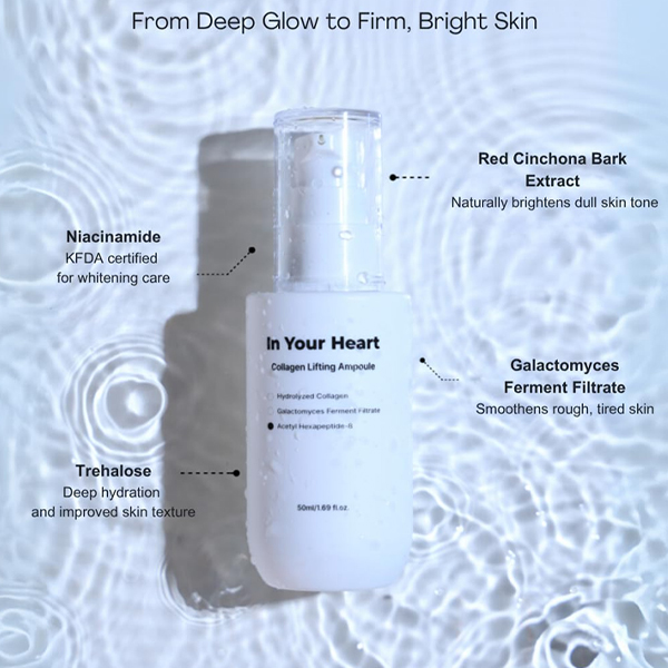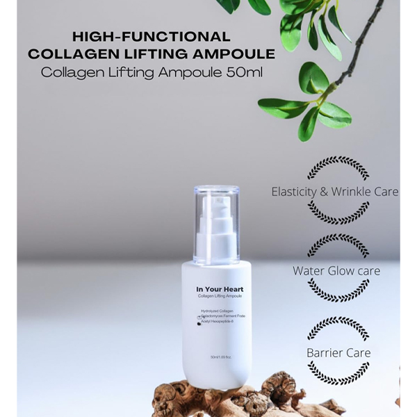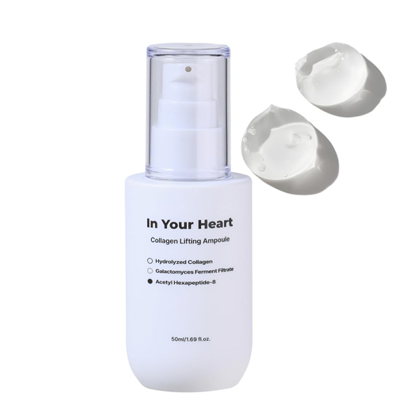 The In Your Heart Collagen Lifting Ampoule is a powerful skincare solution designed to support skin elasticity and hydration. Formulated with hydrolyzed collagen peptides and a 5 Hyaluronic Acid Complex , this ampoule delivers intense moisture and plumps the skin for a smoother appearance.
