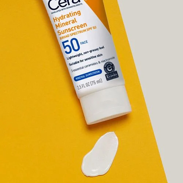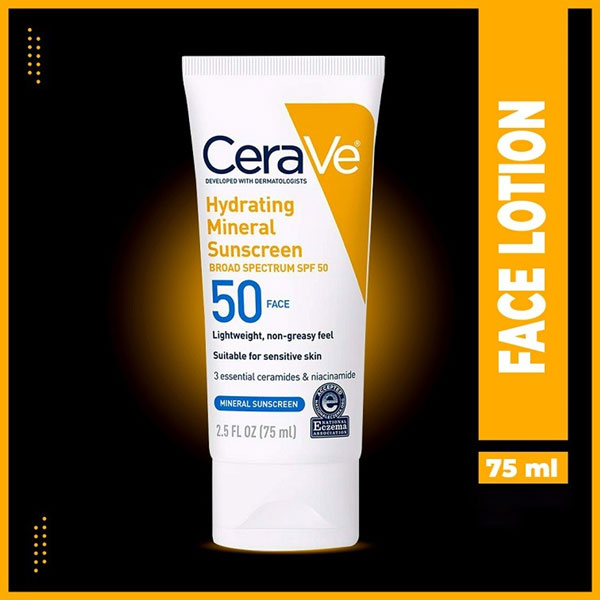 Protect your skin from the sun with a gentle, yet effective face lotion. CeraVe Hydrating Mineral Sunscreen Face Lotion with Broad Spectrum SPF 50 is a 100%-mineral, oil-free sunscreen with titanium dioxide and zinc oxide that forms a protective barrier on your skin’s surface to help reflect the sun’s UVA and UVB rays without irritating sensitive skin. Our formula has three essential ceramides to help restore the skin’s barrier and provide long-lasting hydration, as well as niacinamide to help calm your skin. It has been awarded the National Eczema Association Seal of Acceptance and the Skin Cancer Foundation Daily Use Seal of Approval.
