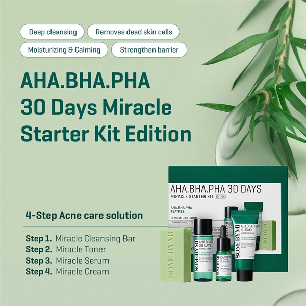 The SOME BY MI AHA BHA PHA 30 Days Miracle Starter Kit is everything you need to soothe, calm and hydrate acne-prone and sensitive skin. This kit includes: