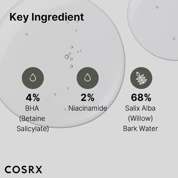 Contains natural BHA ingredient, willow bark water, instead of plain mineral water to maximize exfoliating and clearing benefits without irritation.