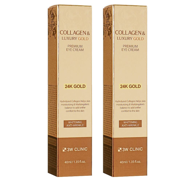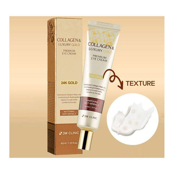 3W Clinic Collagen Luxury Gold Premium Eye Cream 40ml Highly concentrated eye cream revitalizes skin with a range of natural and botanical ingredients.Gold in the cream gently affects the skin, helps to smooth wrinkles and rejuvenate the skin. Also, gold acts as a conductor, allowing the active components to penetrate into the deeper layers of the skin much faster, enhances the process of regeneration and microcirculation, has a powerful antioxidant effect, and slows down the aging process. Tightens the skin and energizes the skin.Collagen is responsible for the strength, elasticity and youthfulness of our skin. Collagen fibers are a kind of “framework” that keeps the skin in a taut state, which prevents the appearance of wrinkles. Elasticity and smoothness of the skin also depend on the synthesis of collagen, so the saturation of the skin with collagen from the outside returns skin elasticity, strengthens the skin, makes it more toned, helps smooth wrinkles.