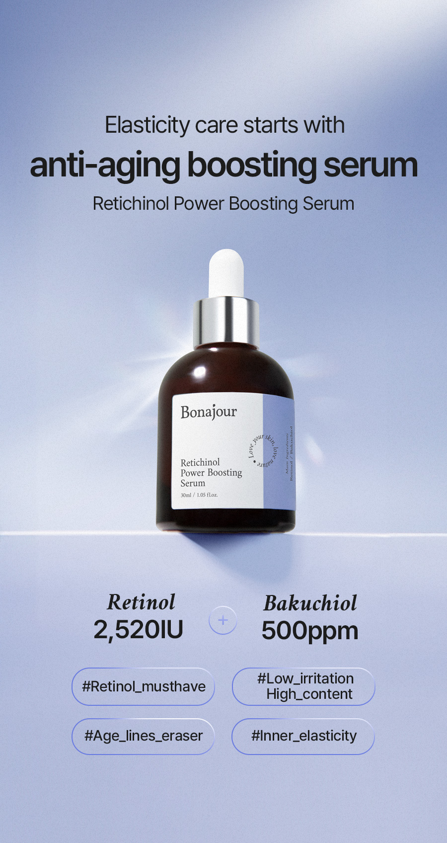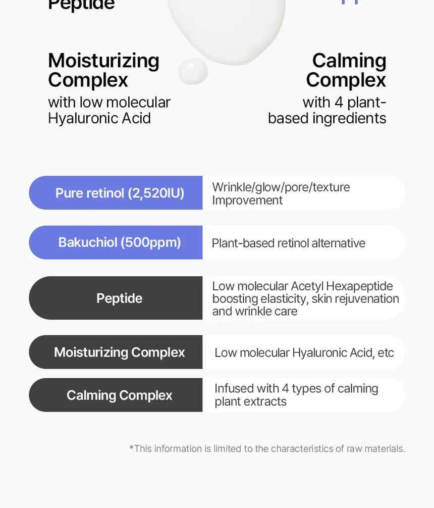 Contains 2520IU retinol; the Korean Ministry of Food and Drug Safety’s certified wrinkle-improving retinol content is over 2500IU
