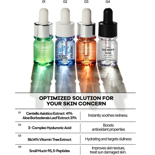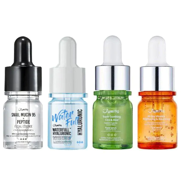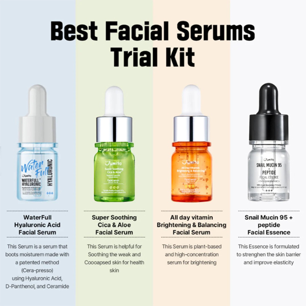 Trial kit contains : Waterfull hyaluronic serum 5ml + All day vitamin brightening&balancing facial serum 5ml + Super soothing Cica & aloe facial serum 5ml + Snail mucin 95+ peptide facial serum 5ml