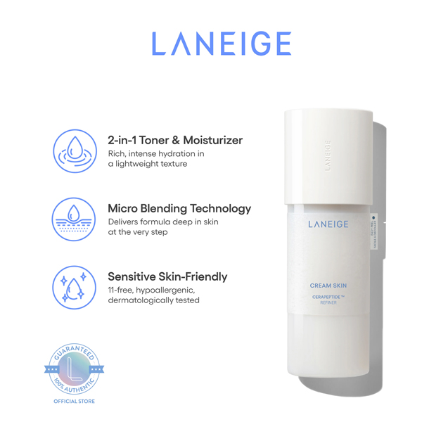 Laneige Cream Skin Cerapeptide Refiner is the revamp of the Cream Skin Refiner with added Ceramide and Peptides to induce a powerful hydrating, firming and nourishing effect.