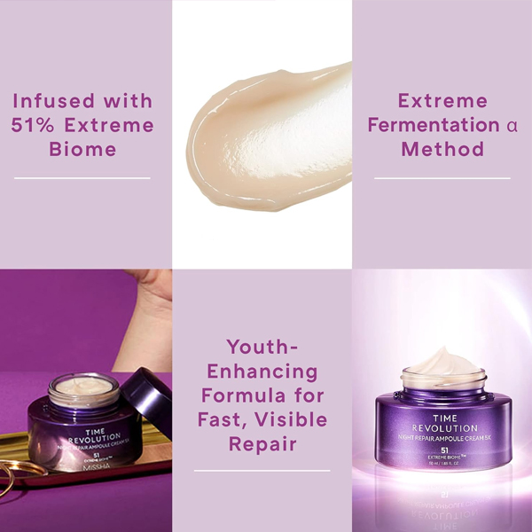 Moisturizing overnight cream formulated with 51% Extreme Biome made of 10 different concentrated fermented ingredients to create highly effective delivery to skin. Clinically proven to improve skin conditions after 10 hours of use. Helps with skin elasticity, wrinkles, pigmentation, density, resilience, moisture, radiance, skin texture, lifting, and soothing.