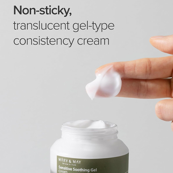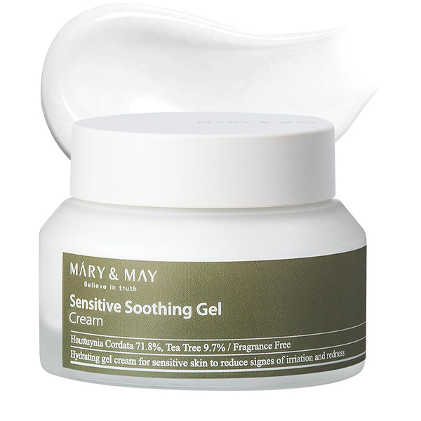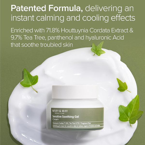 The MARY & MAY Sensitive Soothing Gel Blemish Cream is a fresh, non-sticky, translucent gel texture, providing enough moisture for oily and sensitive skin.Contains 71.8% natural houttuynia cordata extract, which can effectively refine the appearance of pores and skin problems, and combined with 9.7% Australian tea tree extract (with powerful antibiotic property to effectively heal wound), it can soothe and clean sensitive skin without irritation.Containing panthenol and 6 types of hyaluronic acid, it has excellent moisturizing properties and high absorption, keeping the skin moisturized throughout the day.MARY & MAY has developed a formula that helps relieve skin trouble and clean pore care by combining Houttuynia cordata and tea tree, both which are effective to calm the skin.